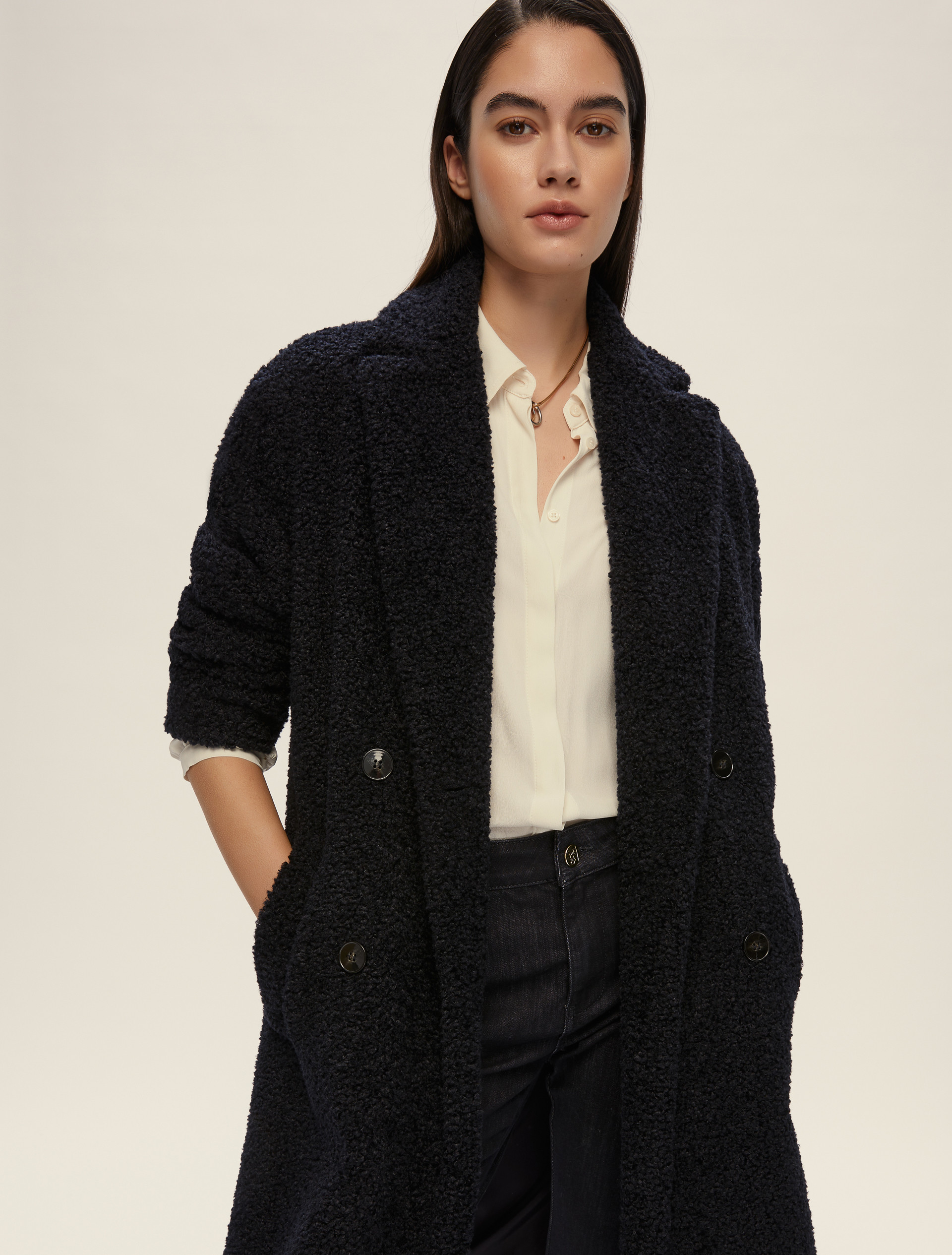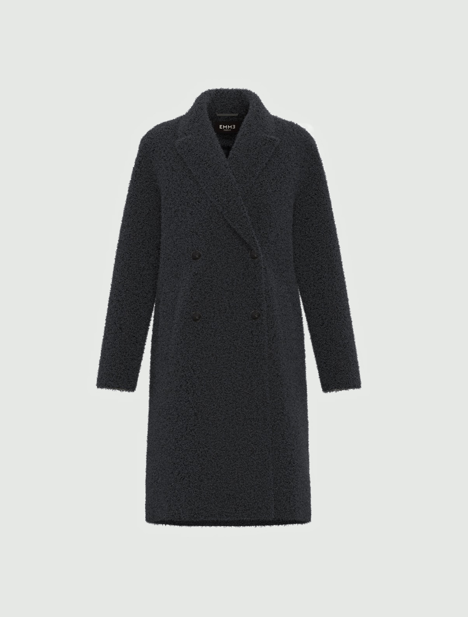 An oversized coat crafted from ultra-comfortable bouclé jersey fabric: the model boasts an enveloping rich material and mannish double-breasted cut.
